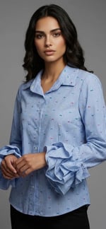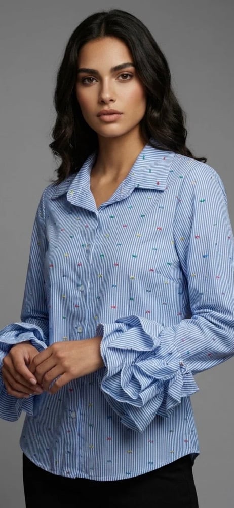 This shirt features a stylish blue and white striped pattern, paired with playful, multicolored embroidery scattered throughout the fabric. The shirt boasts voluminous, ruffled sleeves, adding a touch of elegance and femininity to the design. Perfect for casual or semi-formal occasions, it offers a modern twist on a classic button-up shirt.